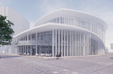 Extension comprenant 2 étages – Restaurant/Lounge avec grande cuisine fonctionnelle (+-100 couverts à l’intérieur et +- 180 couverts avec la terrasse extérieur) au RDC – Grand espace polyvalent avec accès au foyer du bâtiment existant de la Philharmonie.